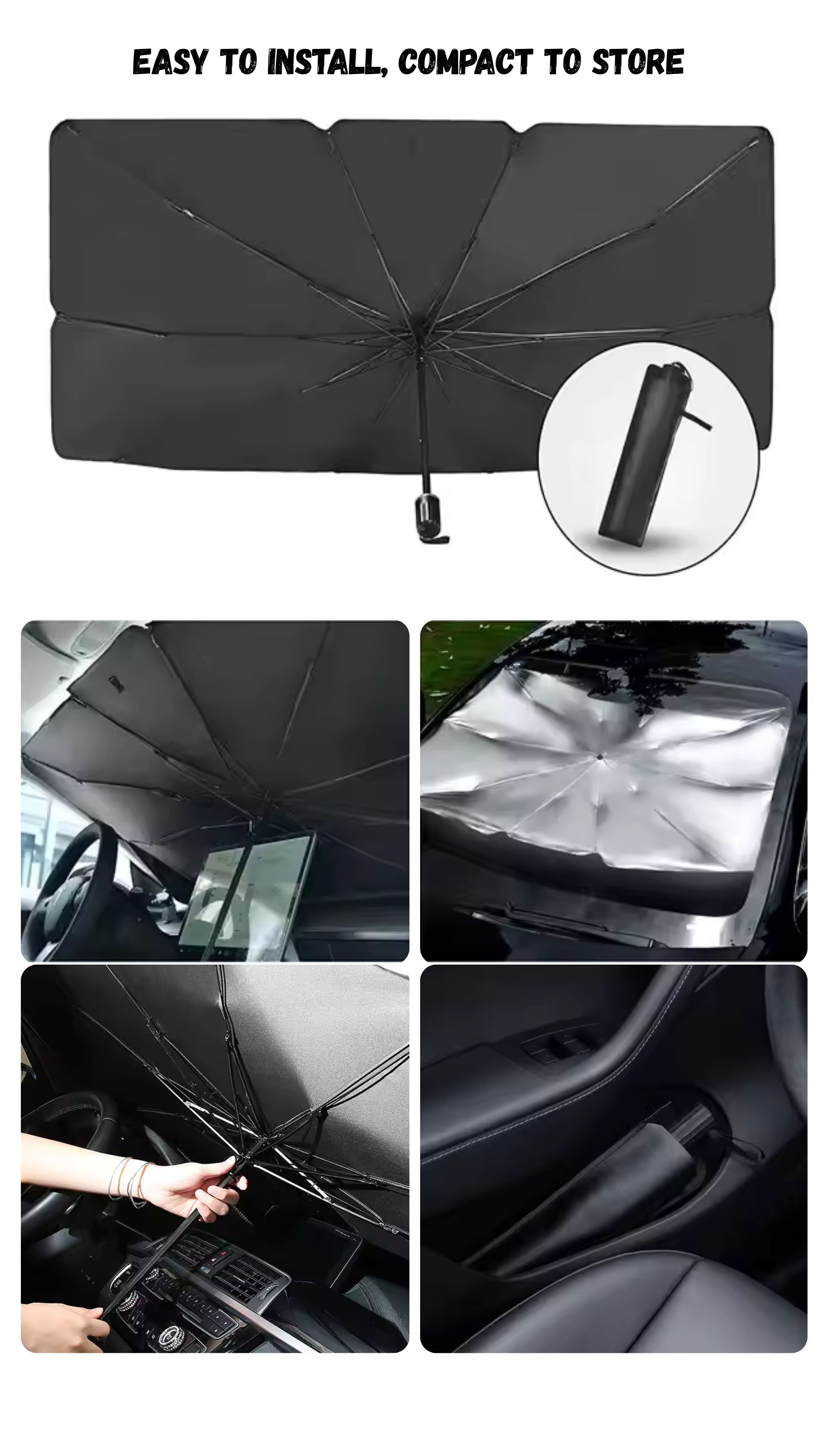 As easy as saying “ugh, it’s hot.” Just open like a regular umbrella and place it inside your windshield. Takes less than 5 seconds. Folding it back? Same story. No suction cups. No drama.